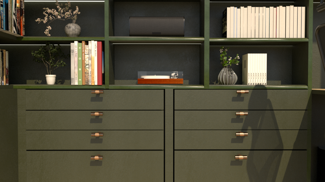 A home office designed to evoke a sense of freshness, security, and calm while also maximizing storage space.